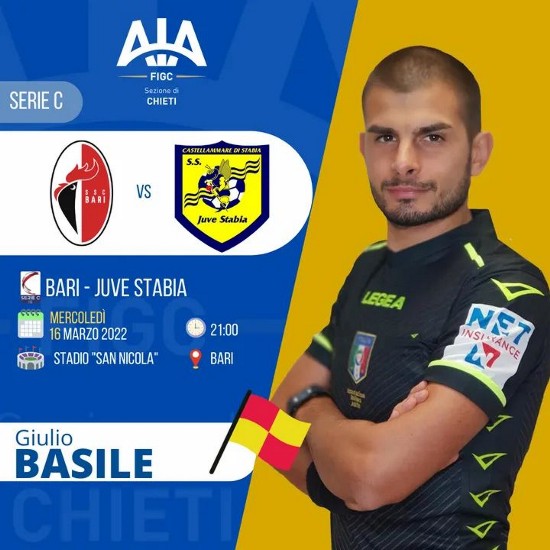 Nuova designazione per l’assistente Giulio Basile, iscritto alla sezione AIA di Chieti. Ieri sera è stato il primo assistente della partita fra la capolista Bari e la Juve Stabia, inserita nel turno infrasettimanale del calendario del girone C della serie C.