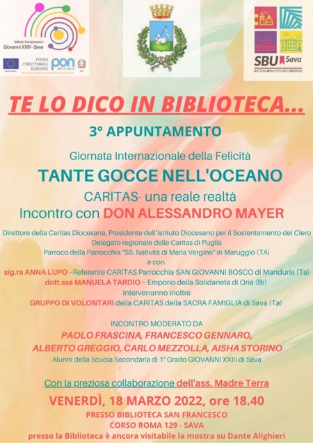 Si terrà questa sera, alle ore 18.40, presso la biblioteca San Francesco di Sava l’ultimo appuntamento della rassegna “Te lo dico in biblioteca”. Promossa dal Comune – Ufficio Servizi Sociali e dall’istituto comprensivo Giovanni XXIII di Sava per la promozione del Sistema Bibliotecario Urbano, la rassegna giunge al termine celebrando la IX Giornata Internazionale della Felicità.