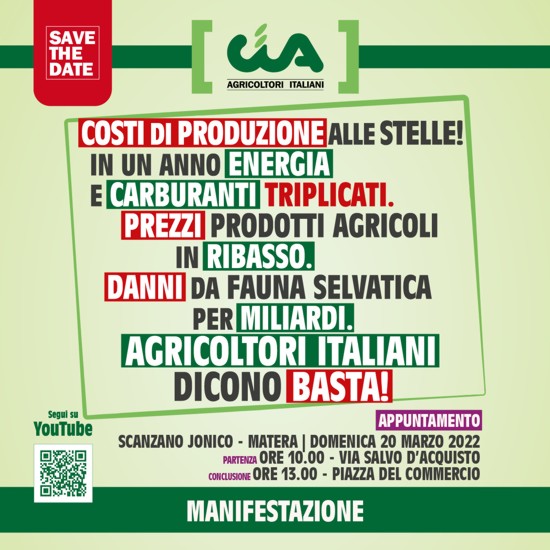 A SCANZANO DA TUTTA LA PUGLIA. “Manifestiamo, e lo facciamo pacificamente e dunque lanciando un segnale ancora più forte in questo momento storico, perché è giusto e necessario che la voce delle imprese agricole, degli imprenditori e dei lavoratori del comparto primario si levi altissima e faccia comprendere alle istituzioni il momento drammatico che stiamo vivendo”, ha dichiarato Giannicola D’Amico, vicepresidente di CIA Agricoltori Italiani della Puglia. “Dalla nostra regione, si muoveranno delegazioni e gruppi di agricoltori da Bari, BAT, Brindisi, Foggia, Lecce e Taranto. Ci uniremo a tutti gli altri gruppi provenienti da ogni parte della Basilicata, ma anche da Calabria, Campania, Molise e Sicilia”.