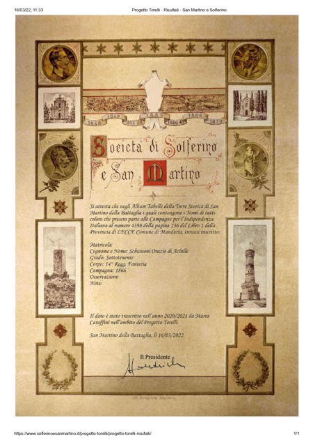 - Nelle immagini: Raffaele Pontremoli (1832-1906): la fanteria italiana respinge un attacco della cavalleria austriaca durante la battaglia di Custoza, San Martino della Battaglia, affresco, 1880; scheda del S.Ten. Orazio Schiavoni, Progetto Torelli - Società Solferino e San Martino;Comuni di Manduria e Avetrana. Elenco dei caduti nelle guerre dell'Indipendenza italiana e nelle guerre coloniali.Nota di risposta della Tenenza dei Reali Carabinieri di Manduria, Museo Nazionale di Castel Sant'Angelo – Roma.