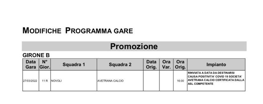 Sono ben 8 i casi di positività riscontrati fra i tesserati dell’Avetrana. Condizione, questa, che ha indotto la Figc a rinviare la partita in programma domenica prossima a Novoli.