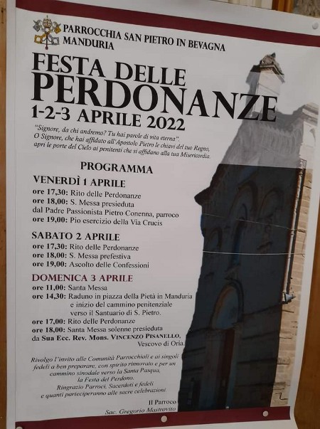 DOMENICA 3 APRILE – Alle 11 Santa Messa; alle 14,30 raduno in piazza della Pietà a Manduria e inizio del cammino penitenziale verso il santuario di San Pietro in Bevagna; alle 17 rito delle Perdonanze; alle 18 santa Messa solenne presieduta dal vescovo di Oria, mons. Vincenzo Pisanello.