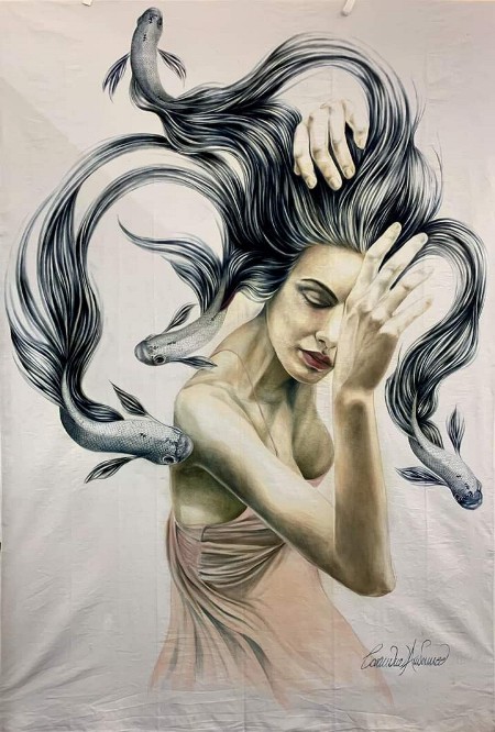 Il suo genere è figurativo in maniera molto singolare. Le raffigurazioni femminili sono distanti ed eleganti. Un’eleganza sottolineata dalla postura delle mani, lunghe e affusolate che fanno pensare ai ritratti della tradizione rinascimentale in chiave moderna.