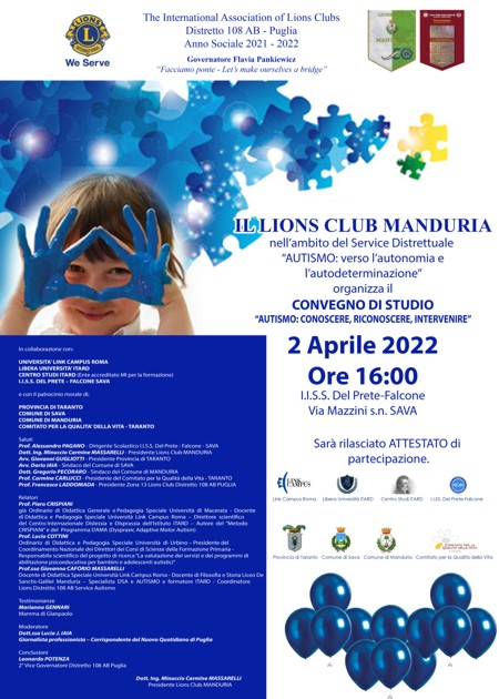 Il convegno, realizzato in collaborazione con l’istituto Del Prete-Falcone di Sava, l’Università Link Campus Roma, la Libera Università ITARD, il Centro Studi ITARD (Ente accreditato Mi per la formazione), e patrocinato dalla Provincia di Taranto, il Comune di Sava, il Comune di Manduria e il Comitato per la Qualità della Vita di Taranto, è finalizzato a sensibilizzare sull’argomento tenendo accesi i riflettori sull’autismo e promuovere la tutela dei soggetti autistici, la loro piena inclusione nel tessuto scolastico, lavorativo e/o sociale, la promozione di un’esistenza soddisfacente e, il più possibile, autonoma, l’aiuto fattivo alle famiglie, troppo spesso lasciate sole. Il vero autismo è uno stato di indifferenza per le iniziative della collettività e i Lions, attraverso questo momento di confronto e formazione, vogliono contribuire a richiamare l’attenzione sui diritti e la tutela in ogni ambito della persona con autismo.