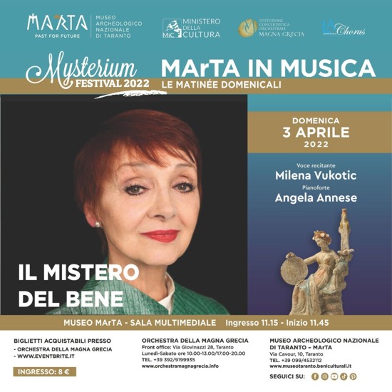 Il biglietto per assistere a “Il Mistero del Bene” di domenica 3 aprile alle ore 11.45 nell’ambito di “MArTA in MUSICA. Le matinée domenicali” potrà essere acquistato nella sede dell’Orchestra della Magna Grecia (a Taranto, in Via Ciro Giovinazzi n° 28) e su www.eventbrite.it. Ingresso consentito dalle ore 11.15 - Inizio ore 11.45. Il costo del biglietto è di 8 euro.