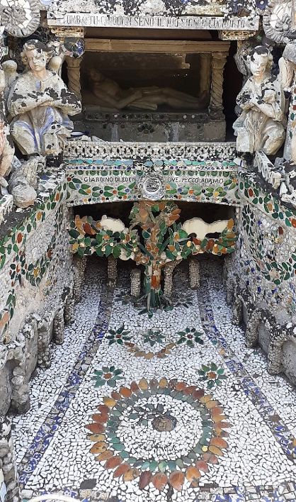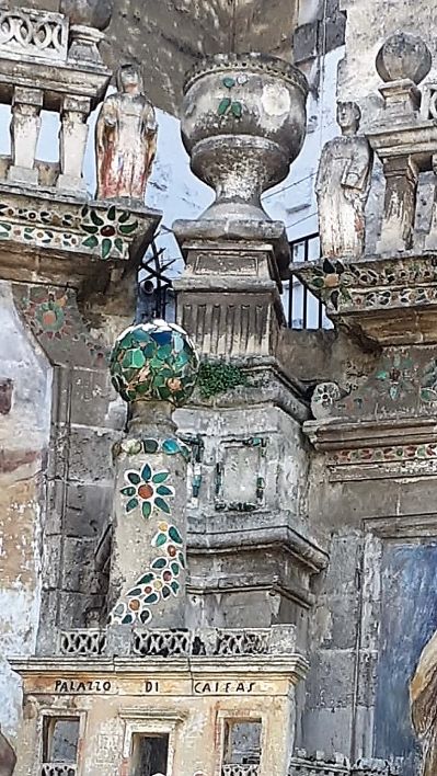 collinette piccole costruzioni, la casa di Anna, di Caifas, il palazzo di Pilato, il tempio di Gerusalemme, il tribunale di Erode. Vi aggiunse, inoltre, sparsi qua e là, il busto di un angelo, una fontana, il pozzo della Samaritana, le figure di Giuda, di Giuseppe d’Arimatea, di Nicodemo. Passò poi a scavare due piccole vasche, ponendovi in una le anguille, le tartarughe nell’altra, mentre sotto la tomba di Cristo Morto (sulla quale si legge ‘Giardini di Eden ove peccò Adamo’), costruì l’Eden, collocandovi le statue di Adamo ed Eva. Furono infine dipinti sul muro alle spalle del complesso quattro affreschi, che l’arciprete Gatti nominò rispettivamente “Col bacio Giuda il suo Signor tradisce”, “Cede Pilato — il Redentor condanna”, Sull’Agnello divino l’empio infierisce”, “Gesù al grave incarco affanna”. Fece infine realizzare il muro di cinta e il cancello di ferro.