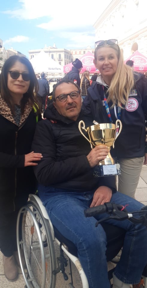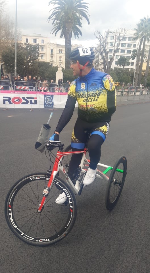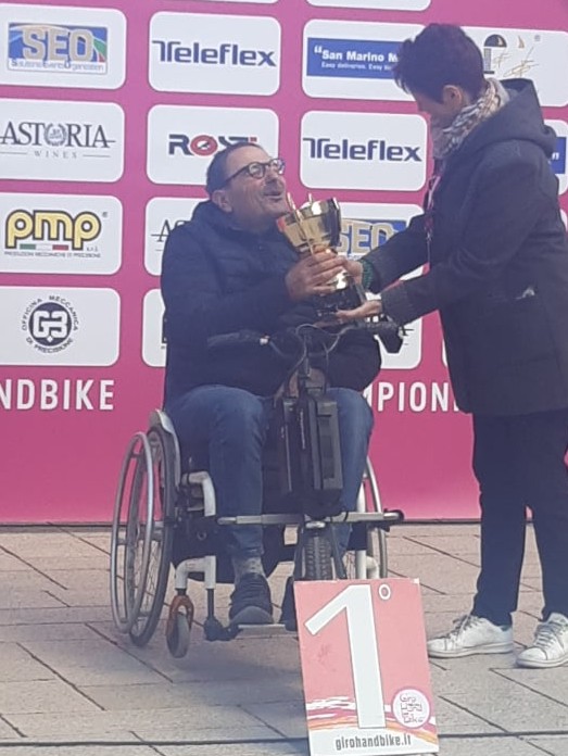 Leonardo Melle in maglia rosa dopo la prima tappa del Giro d’Italia Handbike.