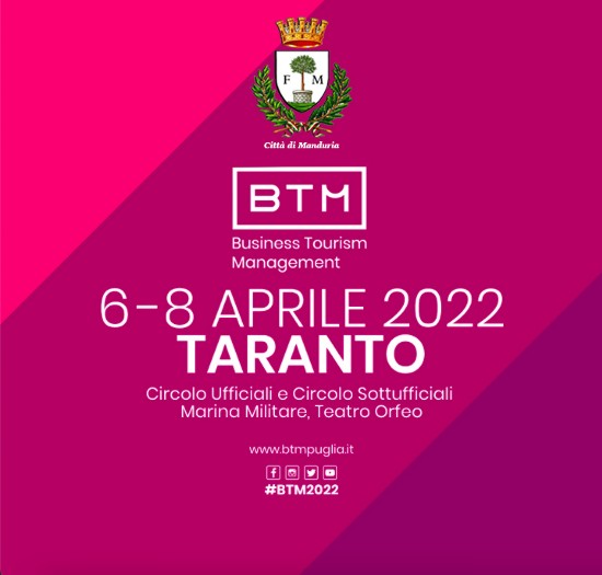 L’Amministrazione comunale ha aderito alla BTM, Business Tourism Management, evento dedicato al turismo, che si terrà a Taranto. Il Comune di Manduria sarà presente con un proprio stand espositivo e promozionale: il numero A14, al primo piano del Circolo Ufficiali Taranto, dal 6 all’8 aprile.