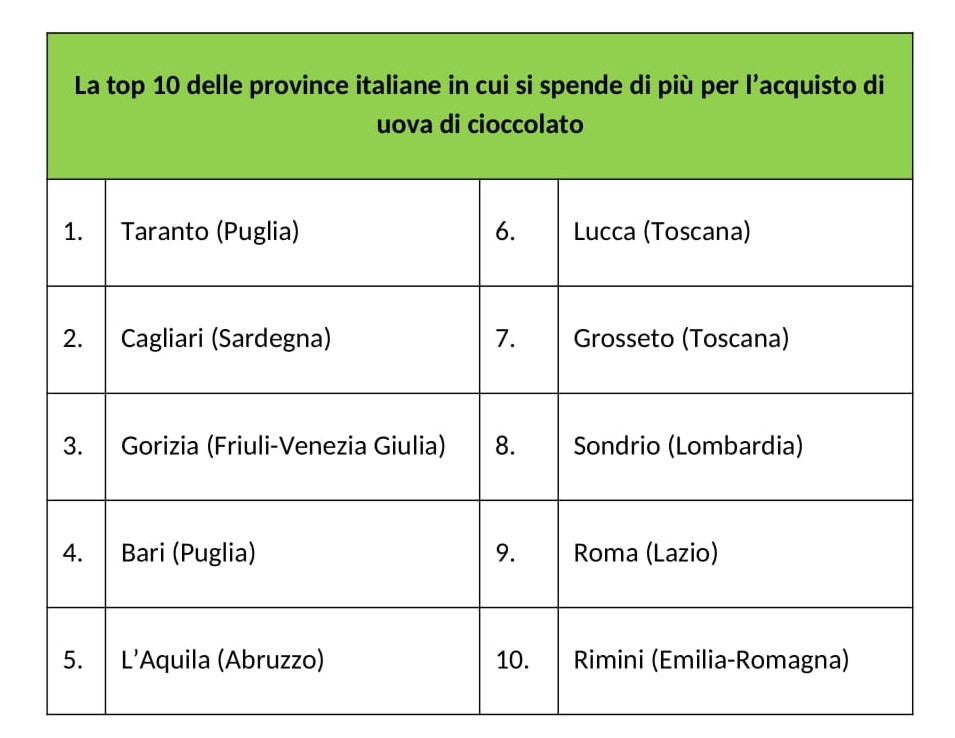 Puglia e Toscana sono le regioni in cui si spende di più per l’acquisto di uova di cioccolato, ciascuna con ben due province nella top 10 delle località che hanno speso maggiormente online per questa categoria: Taranto (1ª) e Bari (2ª)