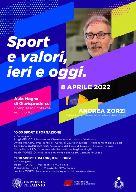 «La presenza di Andrea Zorzi nelle aule della nostra Università è motivo di orgoglio», dice il presidente del corso di laurea in “Diritto e management dello sport” Attilio Pisanò, «Lo scorso ottobre UniSalento ha ospitato un grande pallavolista, Fefè De Giorgi, per presentare un progetto sulle “Soft e Life skills”: da allora l’Università ha instaurato un proficuo rapporto di collaborazione con la FIPAV - Federazione Italiana Pallavolo, che è divenuta partner strategico del corso di laurea. L’intento è quello di coinvolgere gli atleti delle federazioni nelle attività di orientamento. Per questo il corso di laurea ha istituito il riconoscimento “Passione e Formazione”, che nei giorni scorsi è stato assegnato alle atlete della Cutrofiano Volley, vincitrici della finale provinciale FIPAV under 18. Consegneremo lo stesso riconoscimento alla squadra maschile che vincerà le final four provinciali under 18 di inizio maggio».