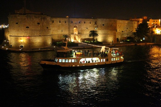Di lì la motonave inizierà il tragitto per raggiungere il mar Grande attraversando il canale navigabile, passando così sotto il ponte girevole e di fianco al castello Aragonese, uno degli scorci più affascinanti di Taranto, da dove è poi possibile ammirare il Lungomare e la Città vecchia, uno spettacolo mozzafiato reso ancora più suggestivo dall’atmosfera notturna.