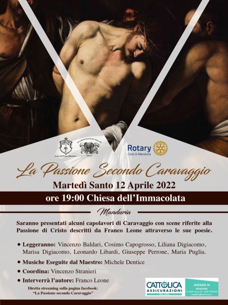 Saranno presentati alcuni capolavori di Caravaggio con scene riferite alla Passione di Cristo, descritti da Franco Leone attraverso le sue poesie,