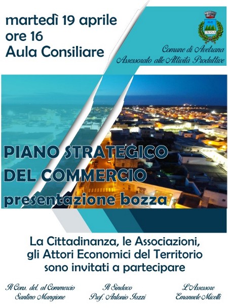 Martedì 19 aprile, alle ore 16, presso la sala consiliare sarà presentata una bozza del Piano Strategico del Commercio. Infatti Luigi Serafini, incaricato per redigere il Piano, coadiuvato da Gregorio Gennari, responsabile dell’Ufficio Commercio, presenteranno una bozza ai commercianti, agli amministratori e alla cittadinanza tutta.