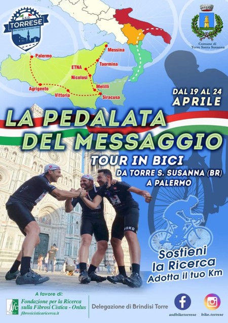 La passione per la bici unita all'impegno benefico. Nasce così, per il terzo anno consecutivo, un’impresa epica: 5 sportivi delle due ruote partiranno martedì 19 aprile da Torre Santa Susanna per percorrere 650 chilometri, pedalando per sei giorni, fino a Palermo (arrivo previsto il 24 aprile), attraverso un itinerario in 5 tappe (Messina, Nicolosi, Siracusa, Vittoria e Agrigento) in favore della Fondazione per la Ricerca sulla Fibrosi Cistica: la malattia genetica grave più diffusa in Europa. Una patologia per la quale non esiste ancora una cura risolutiva e che fin dalla nascita di chi ne è colpito colpisce molti organi, in particolare polmoni e pancreas, portando all’impossibilità di respirare.