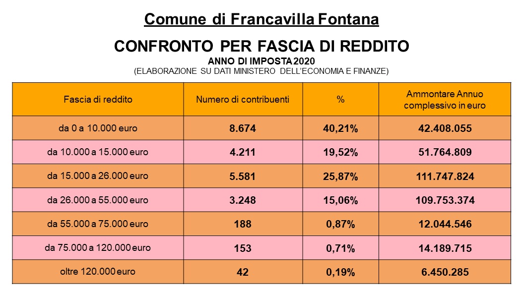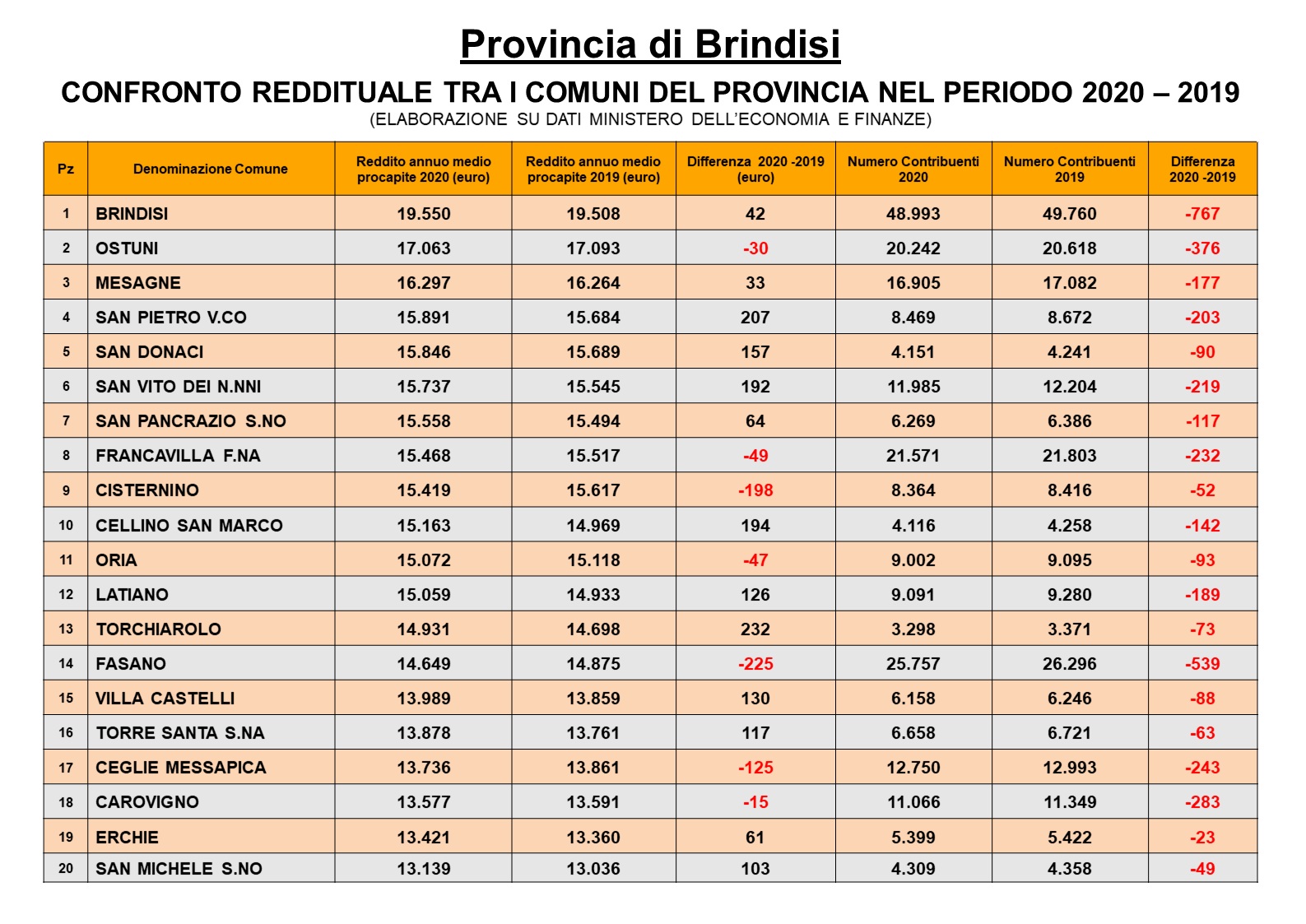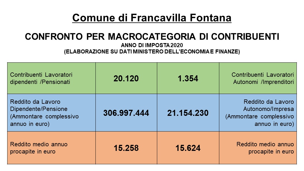 Con i dati rilasciati dal MEF lo scorso 13 aprile, relativi all’anno d’imposta del 2020 (dichiarazione 2021) abbiamo voluto elaborare alcuni dati per rilevare ed evidenziare alcune considerazioni sullo stato sociale quindi economico di un determinato Comune. Abbiamo scelto Francavilla Fontana quale Comune di nostro interesse. Comunque abbiamo anche stilato una classifica sul reddito pro capite tra i comuni della provincia di Brindisi.