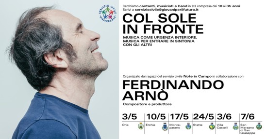 Dal 3 maggio al 7 giugno tra Oria, Erchie, Monteparano, Statte, Villa Castelli e San Marzano di San Giuseppe è in programma Con Sole in Fronte, laboratorio musicale sul paesaggio sonoro organizzato dal servizio civile Note in Campo con il produttore e compositore Ferdinando Arnò. Un laboratorio rivolto a musicisti, scuole e la cittadinanza per identificare e valutare il paesaggio sonoro con l'obiettivo di costruire una mappa ad accesso libero e gratuito sul web che abbia il potenziale di orientare i piani e le politiche per una vita più sana e sostenibile. Un laboratorio per ragionare sul paesaggio sonoro che, con o senza cuffie alle orecchie, parla e canta senza sosta e ci mette in relazione con il paesaggio rurale e urbano, ma soprattutto su noi stessi, sulla nostra musicalità. Siamo ancora in grado mentre passeggiamo nella città o nelle nostre campagne “con il sole in fronte” a cogliere tutti gli aspetti multisensoriali del mondo che ci circonda? Le voci ed i suoni che lo animano: il traffico, le campane, le sirene, ma anche rumori tipici di una fontana, di una bottega, del vento tra le foglie secche. Quei suoni che ci circondano sono la colonna sonora della nostra esistenza. Possiamo essere parte di questa dimensione vissuta e autentica dei luoghi facendo parte della musica del nostro paesaggio sonoro o essere degli inconsapevoli complici della crescita di un “brusio di fondo” in cui “suono” è sinonimo di “rumore”. Un rumore che produce una disaffezione e una conseguente mancanza di ascolto.
