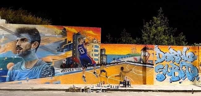 Una bella suggestione è venuta fuori riguardo al soggetto dei due disegni principali: qui a Roma, al centro del murale, c'è un immagine di Andrea da giovanissimo, ripresa tra l’altro da una foto pubblicata dai ragazzi di Avetrana; giù in Puglia, invece, i nostri fratelli e le nostre sorelle del Collettivo DORNO 13 hanno rappresentato un Andrea più grande e più “romano", riprendendo tra l’altro una foto di un’iniziativa al playground e vari elementi che riportano all’Atletico San Lorenzo.