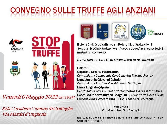 “Stop alle truffe agli anziani”: sarà il tema del convegno che si terrà il prossimo venerdì 6 maggio, alle ore 18, nella sala consiliare del Comune di Grottaglie, in via Martiri d’Ungheria.