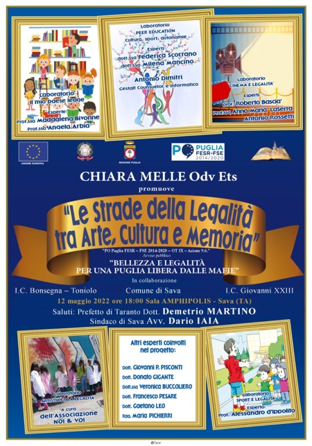 Sarà presentato il 12 maggio alla presenza del prefetto di Taranto Demetrio Martino, del sindaco di Sava Dario Iaia e delle autorità civili e militari, il progetto “Le Strade della Legalità tra Arte, Cultura e Memoria” dell’associazione Chiara Melle che è risultata beneficiaria dell’avviso pubblico regionale “Bellezza e legalità per una Puglia libera dalle mafie”.