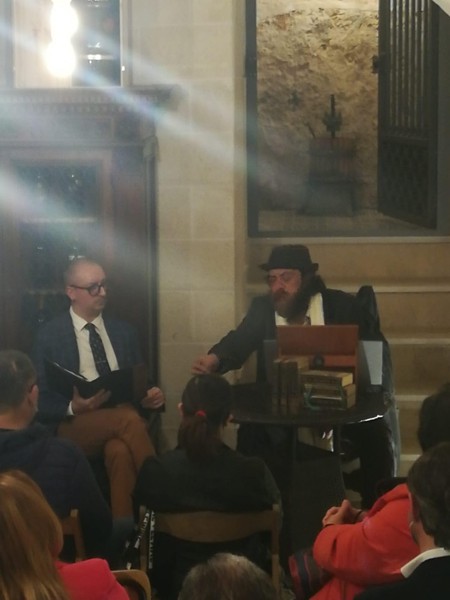 Gli attori Fabio Fornaro (l’intervistatore) e Stefano Zizzi (Alessandro Manzoni) hanno allietato il piccolo e generoso pubblico invitato da Pasquale Pesare e dallo staff dell’enoteca