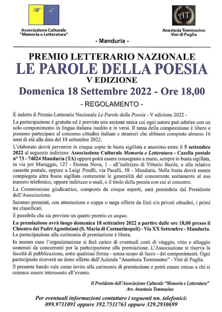 E’ stata indetta la quinta edizione del Premio Letterario Nazionale “Le Parole della Poesia”, promossa dall’associazione culturale “Memoria e Letteratura” e dall’azienda “Anastasia Tommasino – Vini di Puglia”.