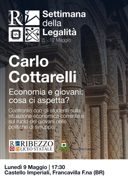 Lunedì 9 maggio, alle 17.30, il noto economista Carlo Cottarelli incontrerà a castello Imperiali i giovani francavillesi per parlare del ruolo delle nuove generazioni nelle politiche di sviluppo del Paese.