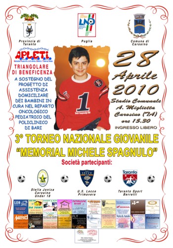 nella suggestiva cornice del Castello D’Ayala Valva, il 3° Memorial dedicato a Michele Spagnulo, giovane della comunità di Carosino prematuramente scomparso tre anni fa. Si tratta di un appuntamento annuale che pone sotto la lente d’ingrandimento della solidarietà, grazie alla generosità e alla forte tempra di chi è stato toccato dalla dolorosa vicenda, Grazio Spagnulo e Maria Rita Pastore, genitori di Michele, il problema delle emopatie e i tumori dell’infanzia.Nel corso della cerimonia di presentazione del torneo di calcio in programma, invece, il 28 aprile prossimo allo stadio “Miglietta” di Carosino, interverranno i genitori di Michele a cui è dedicato il Memorial, il sindaco del comune di Carosino, dott. Francesco Sapio, l’assessore comunale allo sport, Giuseppe D’Antona, gli assessori provinciali, Costanzo Carrieri e Umberto Lanzo, il neo presidente dell’associazione Apleti Monia Pinzaglia e un medico del reparto oncologico della Clinica Pediatrica di Bari dott. Francesco De Leonardis.