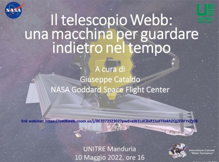 Oggi pomeriggio, alle 16, l’Unitre Manduria presenta l’evento “Il telescopio Webb, una macchina per guardare indietro nel tempo”, con la partecipazione straordinaria dell’ingegnere della Nasa Giuseppe Cataldo, cittadino di Lizzzano, progettista responsabile del super telescopio lanciato lo scorso dicembre 2021 nello spazio.