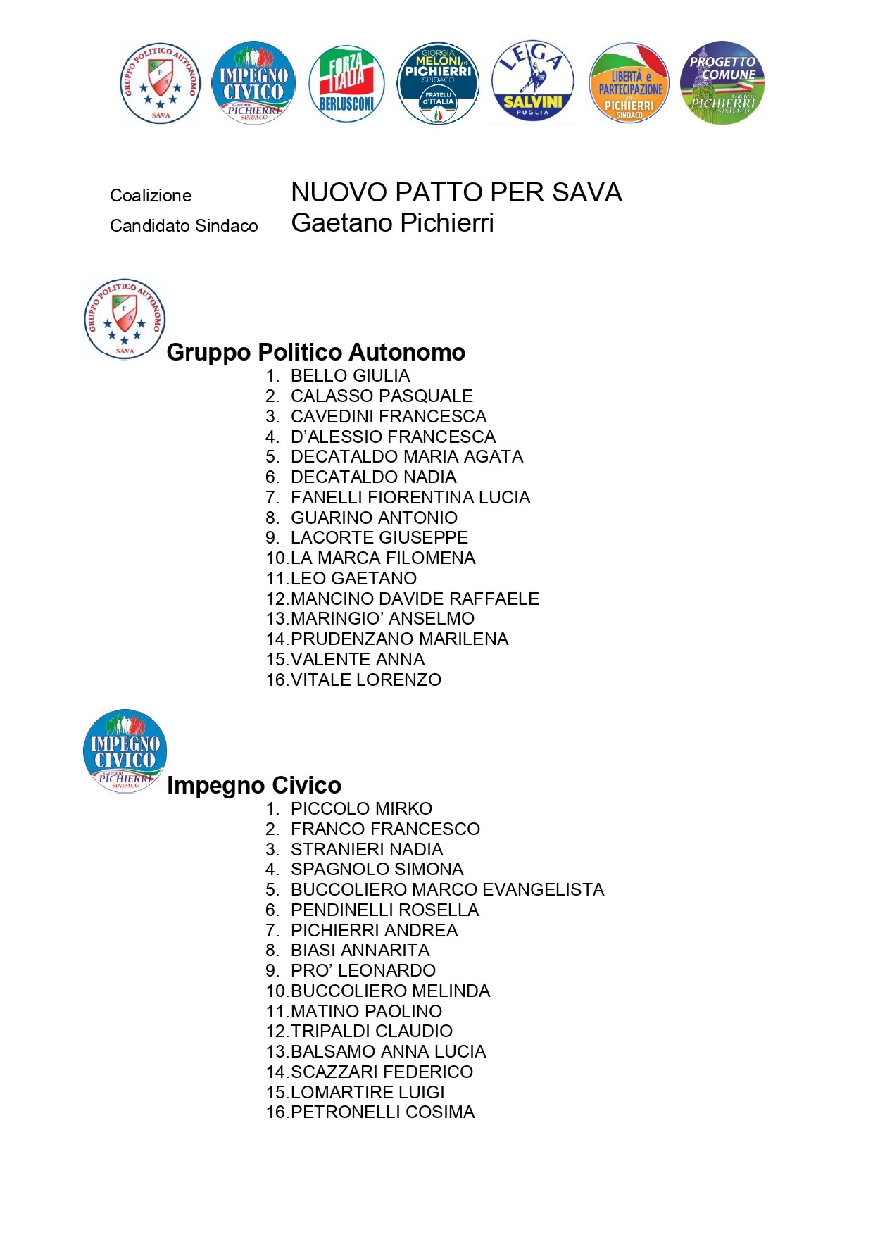 Vi proponiamo i candidati a consigliere comunale delle sette liste dello schieramento “Nuovo Patto per Sava”, che sostiene la candidatura a sindaco di Gaetano Pichierri.