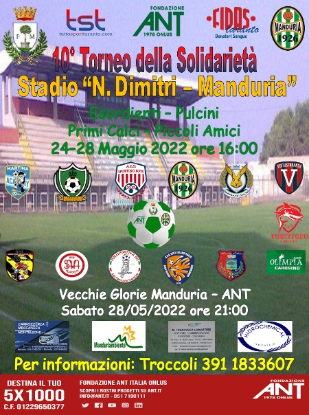 E' iniziato il conto alla rovescia per la decima edizione del Torneo della Solidarietà ANT, che si terrà dal 24 al 28 maggio allo stadio “Dimitri” di Manduria e che vedrà protagoniste le categorie Esordienti, Pulcini, Primi Calci e Piccoli Amici.