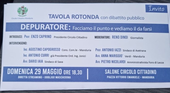 Introduce Enzo Caprino, presidente del Circolo Cittadino. Intervengono Agostino Capogrosso, consigliere comunale; Antonio Curri, già presidente dell’Ordine degli Ingegneri della Provincia di Taranto; Dario Iaia, sindaco di Sava; Antonio Iazzi, sindaco di Avetrana; Anna Mariggiò, dei Verdi di Manduria; Pietro Nicolardi, avvocato amministrativista del Foro di Lecce. Modera i lavori il giornalista Reno Dinoi.