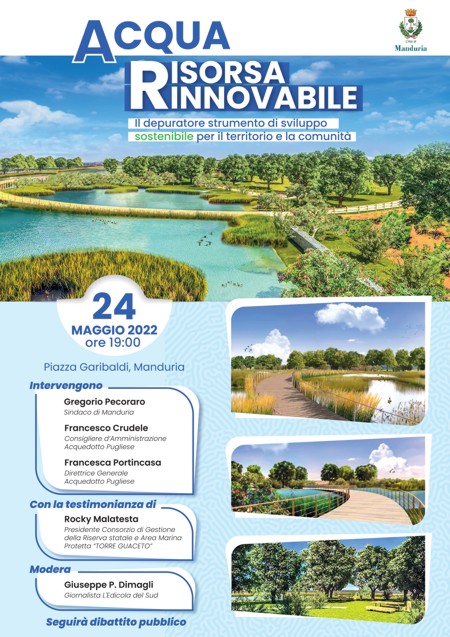 Interverranno Gregorio Pecoraro, sindaco di Manduria; Francesco Crudele, consigliere d’amministrazione Acquedotto Pugliese; Francesca Portincasa, direttrice generale Acquedotto Pugliese; Rocky Malatesta, presidente del consorzio di gestione della Riserva Statale e Area Marina Protetta “Torre Guaceto”. Modererà l’incontro Giuseppe P. Dimagli, giornalista de “L’Edicola del Sud”.