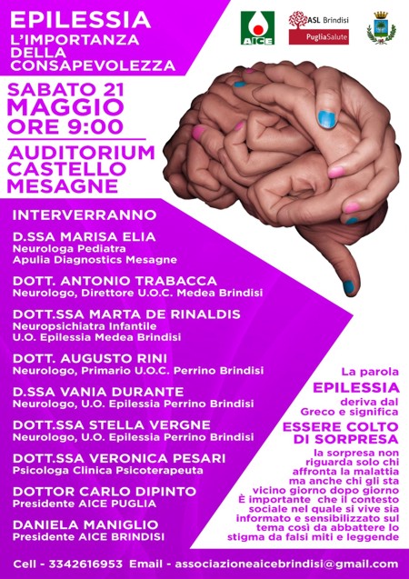 Si svolgerà domani (sabato 21 maggio), nella splendida cornice dell’auditorium del Castello di Mesagne, a partire dalle ore 9, un importante convegno sull’epilessia, una patologia che interessa 500.000 persone in Italia. L’iniziativa è organizzata dall’AICE (Associazione Italiana Contro l’Epilessia) regionale Puglia insieme alla sezione di Brindisi e vede il patrocinio sia dell’ASL Brindisi e sia dell’Amministrazione comunale di Mesagne.
