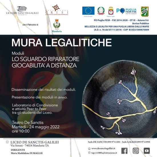 Si terrà martedì mattina, giorno 24 maggio a partire dalle 10:00 un evento di “restituzione” di quanto appreso durante le attività già svolte nell’ambito del progetto “Mura Legalitiche”. Presso l’aula magna del liceo De Sanctis-Galilei i giovani partecipanti dei cinque percorsi conclusi nelle settimane passate presenteranno ai loro compagni di scuola quanto vissuto in forma laboratoriale.