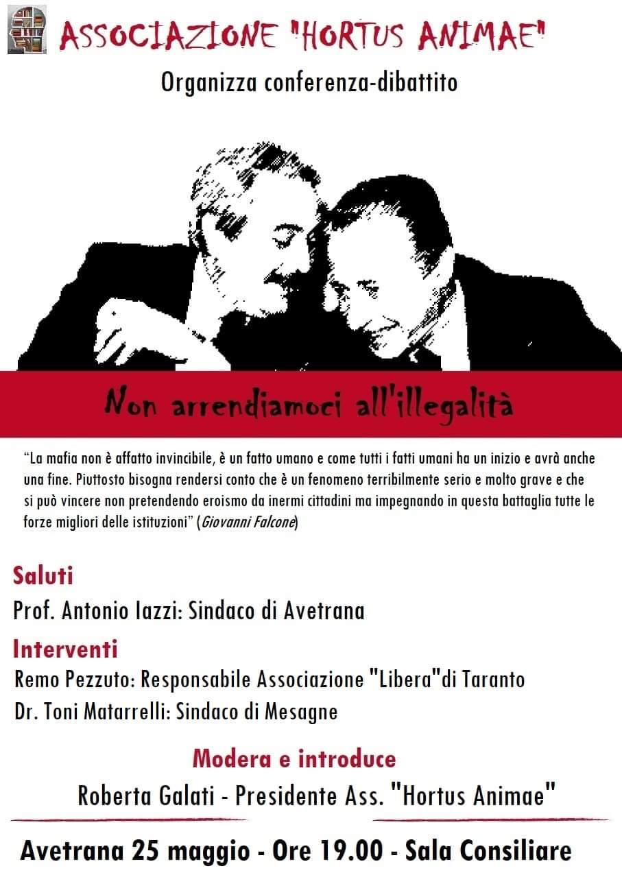 A 30 anni dalla strage di Capaci, nel ricordo dei giudici Falcone e Borsellino, l’associazione culturale Hortus Animae organizza un convegno-dibattito sul tema, con Remo Pezzuto, rappresentante provinciale di “Libera” e Toni Matarrelli, sindaco di Mesagne, una città che ha saputo trovare nella “cultura” lo strumento di riscatto e di crescita, tanto da essere candidata a capitale della cultura, dopo essere stata, circa un ventennio fa, nota come capitale della SCU.