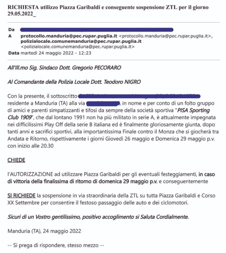 La dimostrazione sta nella richiesta che alcuni tifosi di fede pisana hanno avanzato, attraverso una Pec, al sindaco Pecoraro e al Comandante della Polizia Municipale. Poiché il Pisa disputerà domani e domenica contro il Monza la finale dei play off di serie B, per i tifosi nerazzurri della squadra toscana si profila l’entusiasmante possibilità di festeggiare il ritorno in serie A.