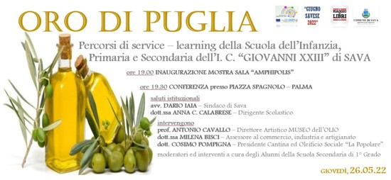 Si intitola “Oro di Puglia” il percorso di service – learning che i tre gradi di scuola dell’istituto comprensivo Giovanni XXIII di Sava portano in pubblico questa sera (giovedì).