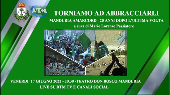 E’ un evento dedicato a un anno incredibile della storia recente del Manduria Calcio. la memorabile promozione dei biancoverdi dall’Eccellenza alla serie D nella stagione 2000-2001, dopo aver vinto i play off nazionali. Una festa nella festa al “Nino Dimitri”, piazza Garibaldi gremita, mai più così carica di gente ed entusiasmo negli ultimi 20 anni. Proprio a distanza di 20 anni (a giugno saranno 21) verrà celebrato l’anniversario con una puntata speciale del format “Triplice fischio” di Rtm, condotto dal giornalista Mario Lorenzo Passiatore, autore e promotore del progetto “Torniamo ad abbracciarli”. L’iniziativa è stata accolta dal Comune di Manduria, che ha inserito la serata nel programma estivo 2022.