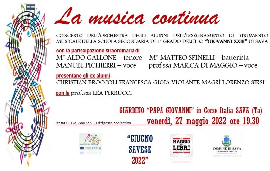 Appuntamento quindi per questa sera (venerdì), alle ore 19.30, nel giardino della scuola “Papa Giovanni” di Sava, per un altro appuntamento del cartellone degli eventi di fine anno scolastico, inserito anch’esso nel Giugno Savese 2022.