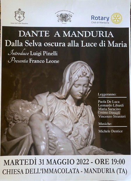 L’evento, che si terrà martedì 31 maggio, introdotto dal prof. Luigi Pinelli, sarà presentato da Franco Leone e brani significativi della Divina Commedia saranno letti, oltre che dallo stesso presentatore, anche da Paola De Luca, Cosimo Dimagli, Leonardo Libardi, Maria Saracino e Vincenzo Stranieri, con musiche eseguite da Michele Dentice.
