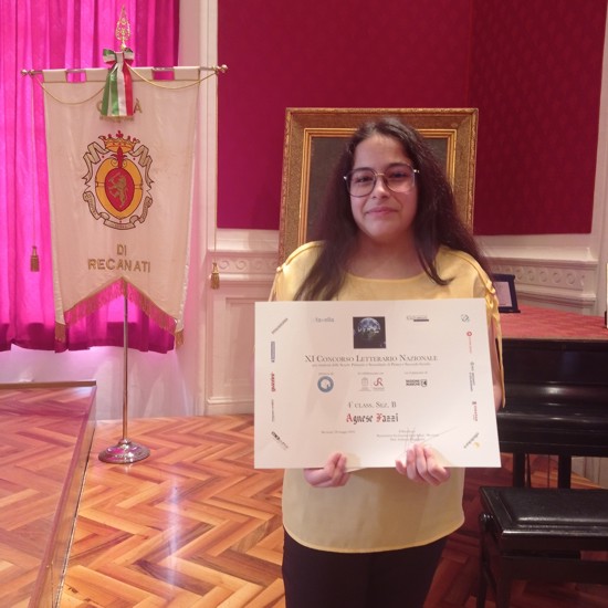 «La cerimonia – ha raccontato Agnese Fazzi – si è svolta in un’atmosfera quasi magica in un’aula gremita davanti alla giuria, presieduta dal sindaco di Recanati Antonio Bravi e dall’assessora alla Cultura Rita Soccio, persone che hanno indirizzato i loro interventi verso la sensibilizzazione alla cultura. Tutto ciò – ha concluso l’alunna – mi gratifica e mi dà una motivazione ulteriore per continuare a scrivere. Motivazione che ho potuto coltivare anche grazie alla disponibilità e al supporto che mi è stato fornito dal dirigente scolastico Maria Rita Pisarra e dal vicario Tullio Zanchi, nell’ambito dell’offerta formativa dell’istituto, nonchè dalla professoressa di Italiano per l’opportunità di crescita che offre ai noi alunni e dalla mia famiglia per avermi permesso di vivere in loco un’esperienza indimenticabile».