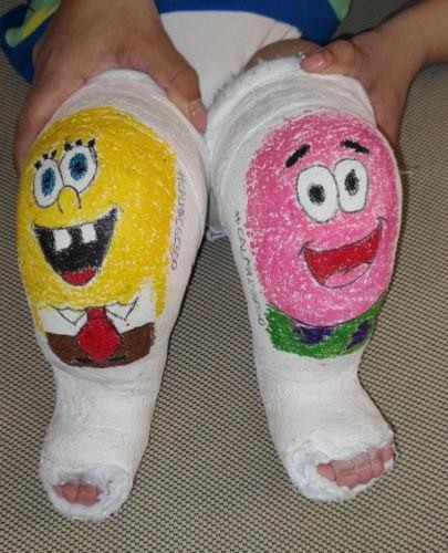 I simboli e i messaggi di pace trionfano sui gessi dei piccoli pazienti di ortopedia del Giovanni XXIII. Ma c’è anche un avambraccio decorato con il guanto dell’infinito di Thanos della Marvel, richiami alle squadre di calcio, SpongeBob sul piede del piccolo in trattamento per piede torto congenito e delle farfalle per sentire meno il peso di uno stivaletto di gesso.