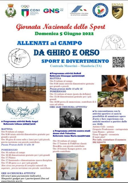 In occasione della XIX Giornata Nazionale dello Sport, al “Campo da Ghiro e Orso” si svolgerà una giornata ricca di manifestazioni sportive e culturali in collaborazione con diverse associazioni sportive del territorio di Manduria e comuni limitrofi! Ci sarà tanto sport e tanto divertimento! Non mancate! Di seguito il programma dell'intera giornata: