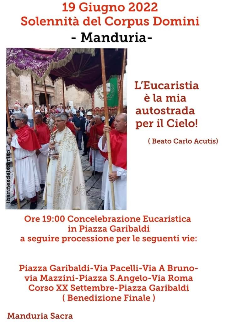 Domenica 19 giugno vi saranno, a Manduria, i festeggiamenti del Corpus Domini. Così come pubblicato dalla pagina Fb Manduria Sacra, ecco il programma: