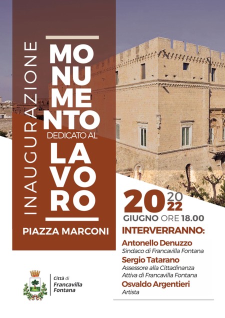 Lunedì, alle 18, l’Amministrazione comunale, in collaborazione con le organizzazioni sindacali, scoprirà in piazza Marconi un monumento realizzato dall’artista Raffaele Argentieri dedicato al lavoro e ai maestri artigiani di Francavilla Fontana.