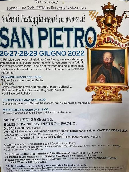 LUNEDI’ 27 GIUGNO – Ore 19, concelebrazione con i sacerdoti diocesani nati nel comune di Manduria.