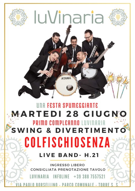 Swing & divertimento con il concerto della band “COLFISCHIOSENZA” in programma martedì 28 giugno presso lo spazio eventi del winebar “LuVinaria” di Torre Santa Susanna (inizio ore 21 con ingresso gratuito; consigliata la prenotazione del tavolo 388.7557521).