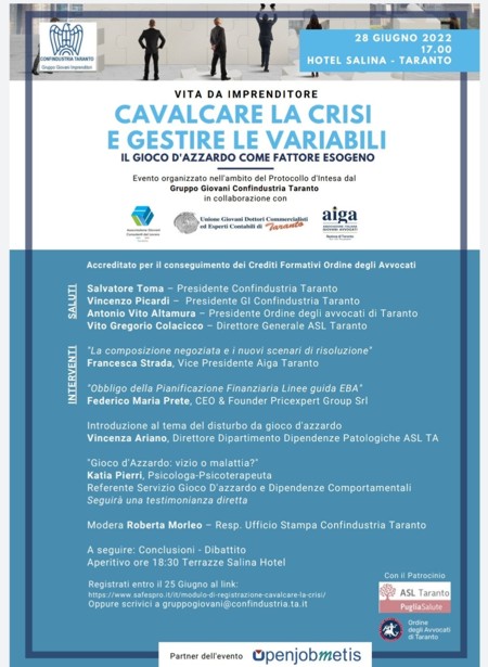 L’incontro di martedì è frutto di un lavoro corale che ha visto impegnati, oltre ai giovani industriali di Confindustria Taranto, la direzione generale Asl di Taranto, che attraverso il Dipartimento Dipendenze Patologiche ha da subito sposato il progetto, gli ordini professionali già citati e l’Agenzia per il Lavoro Openjobmetis SpA, main partner, che porterà i saluti con Liviana Muscato, responsabile Commerciale Openjobmetis.
