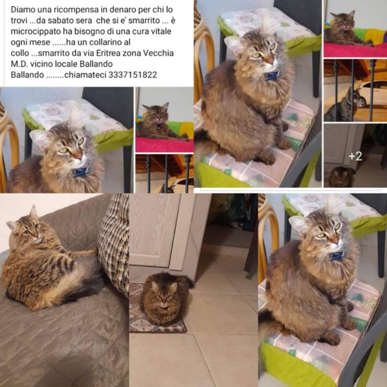 Da sabato sera si è smarrito il gatto che vediamo nella foto. E’ microchippato, ha bisogno di una cura vitale ogni mese ed ha un collarino. Il gatto si è smarrito nella zona di via Eritrea, la zona della vecchia M.D, nei pressi del locale Ballando Ballando.