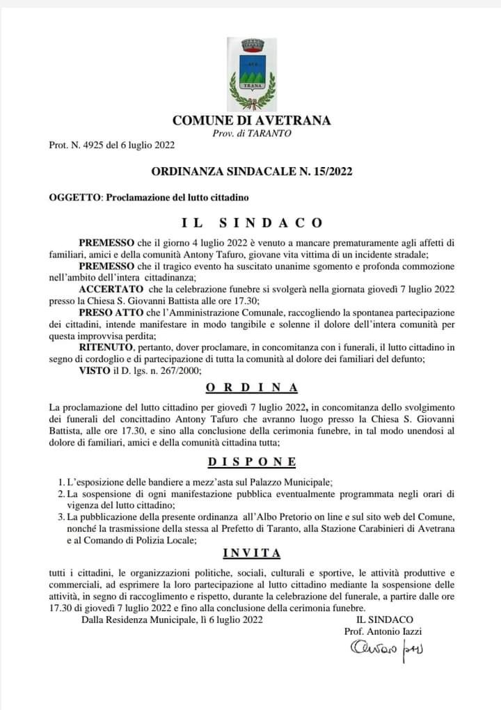 L’Amministrazione comunale di Avetrana proclama il lutto cittadino in concomitanza con lo svolgimento dei funerali del giovane Antony Tafuro, morto nei giorni scorsi a causa di un incidente stradale. I funerali avranno luogo presso la chiesa di San Giovanni Battista, alle ore 17,30. Il lutto cittadino sarà in vigore sino al termine della cerimonia funebre.